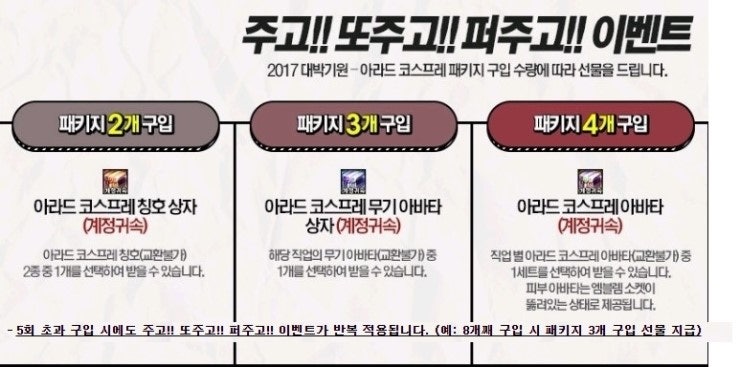 주고또주고 구성품을 남겨드리는 것을 말합니다. http://blog.naver.com/anstkd8247/220936530800 <- 대리패키지 150개 이상 진행중입니다. 본문출처 : http://blog.naver.com/anstkd8247/220917322386 (1810마일리지 + 칭호 + 무기 + 아바타9피스) = 500만원에 제공해드립니다. 패키지 5셋 단위로만 해드립니다 / 최대 10셋까지 가능합니다.