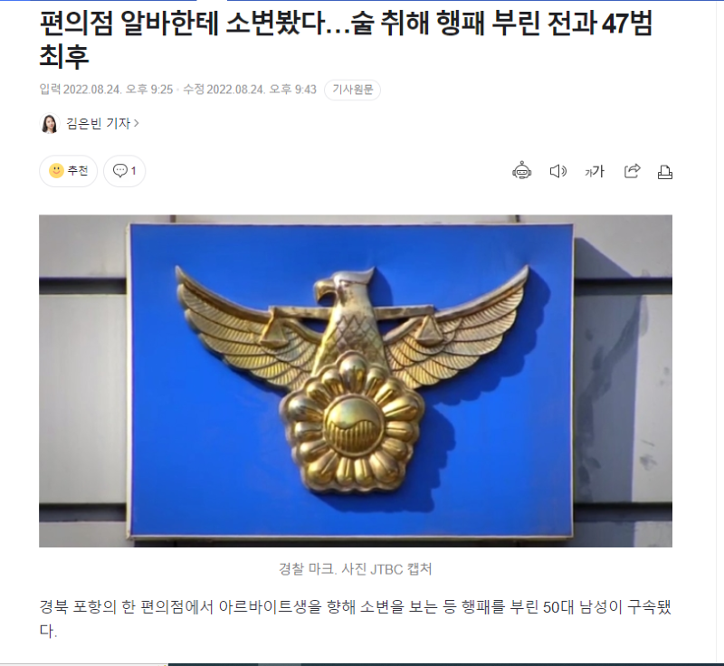 | 소변 본다고 행패 부린 50대 전과 47범https://n.news.naver.com/mnews/article/025/0003218945?sid=102