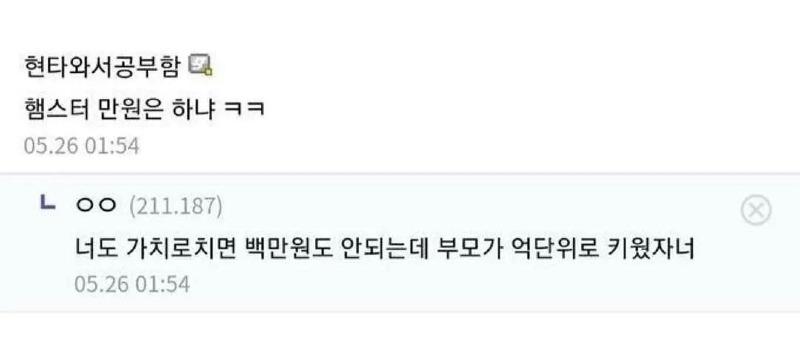 원래 게시글 제목은 [햄스터 만원은 하냐?]인데 반말이라서ㅋㅋ