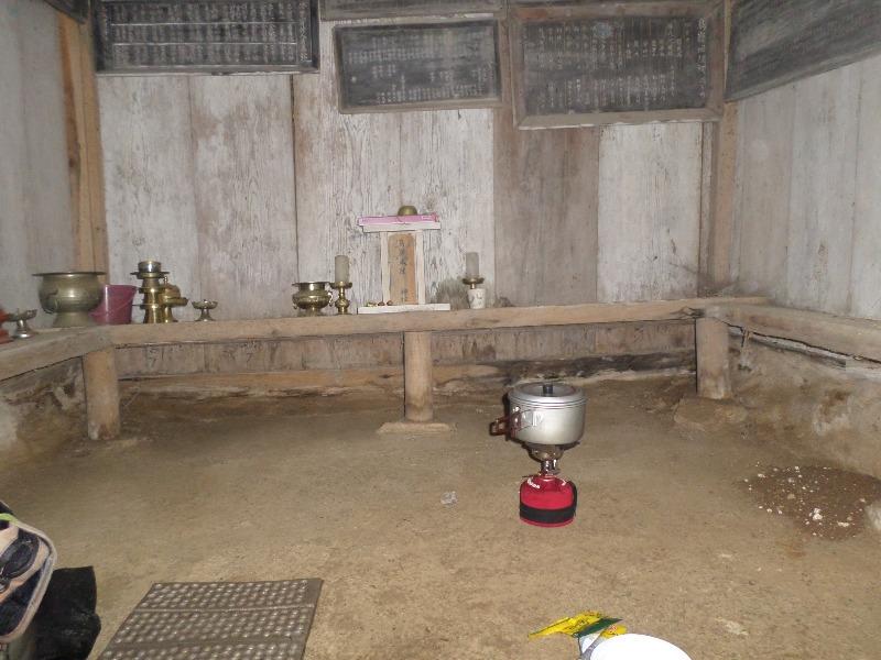 그 덕분에 지금과 같이 비가 주룩주룩 내리는 날에도 떨지않고 산행할 수 있는 것이다 배가 출출했고 점심을 먹을 자리를 찾는데 산신각이 나왔고 바로 들어갔다 이때가 만약 야영할 장소를 생각하고 있었다면 얼씨구나 하고 배낭을 풀었을 것이다 산신각에서 1박을 한 경우는 여러번 있는데 산신할배하고 실강이를 한적도 있다 각설하고 때맞춰 나온 산신각 덕분에 편하게 여유있게 점심을 먹을수 있었다 그리고 산신각을 나오니 비는 그쳐 있었고 드문드문 파란하늘도 보였다