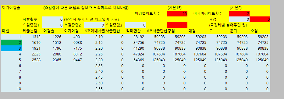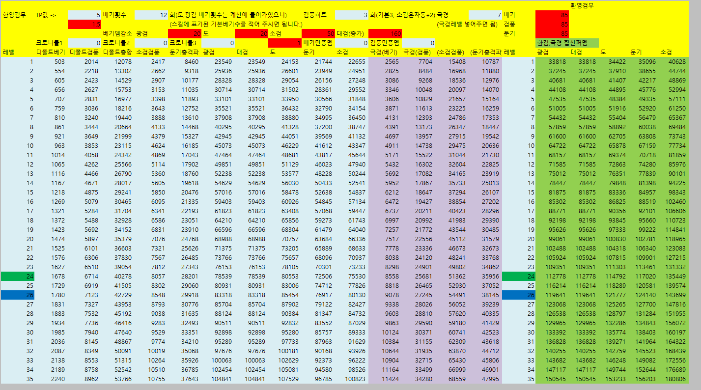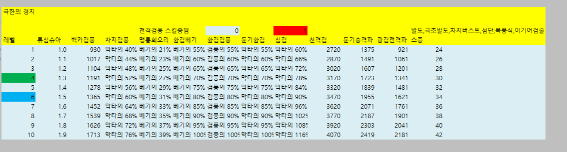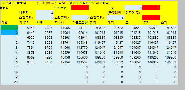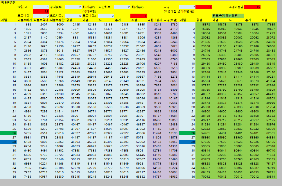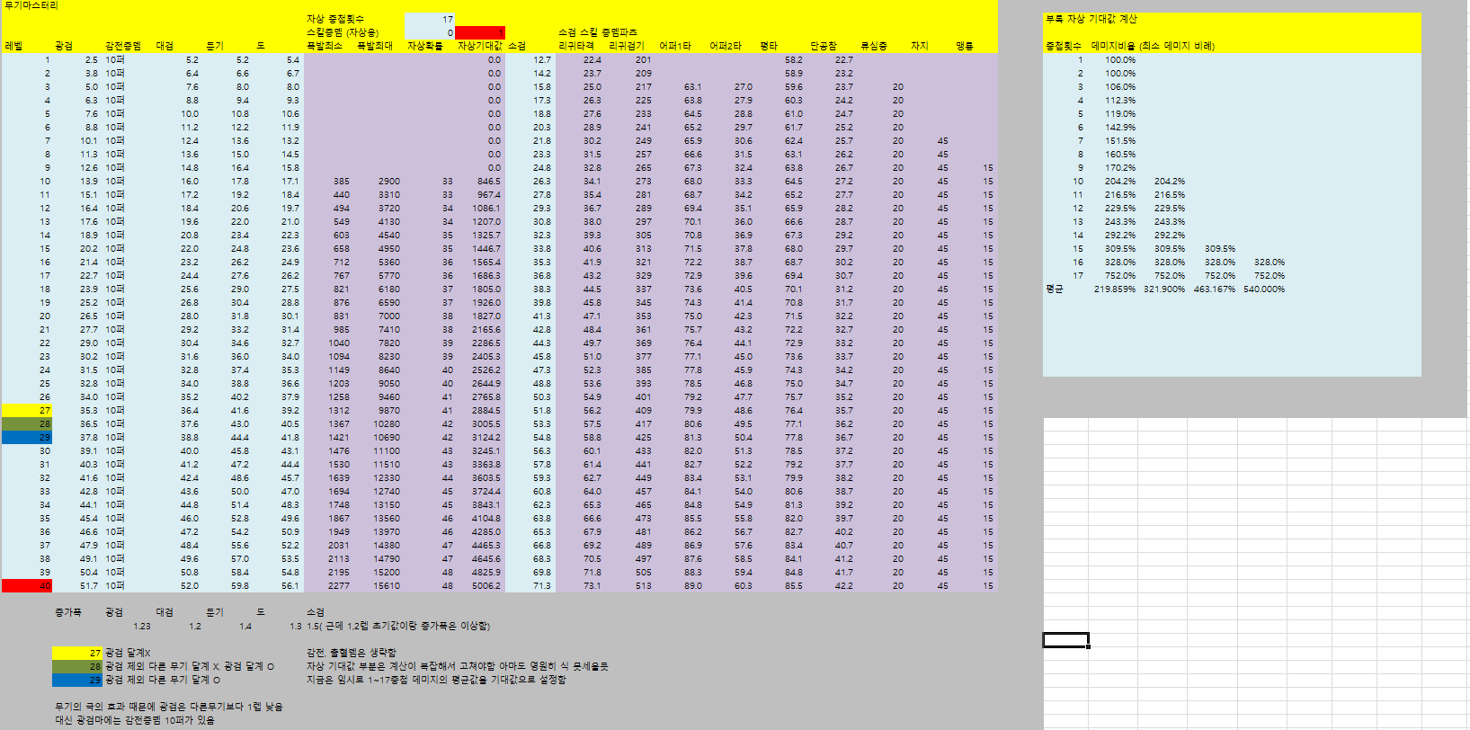 [웨펀마스터] 웨퐁 스킬표 170114거의 2년만에 갱신하는거같은데 옛날에비해 계산식이 많이 쉬워짐. 예전엔 발도 n인증뎀같은거 계산하느라 고생했는뎅 엑셀파일은 블로그에 올림 http://blog.naver.com/tr8425/220911036938" target="_blank"> http://blog.naver.com/tr8425/220911036938 거 스킬 퍼뎀 도움요청하던 아죠시 이거써 --------------------------------- 170114 18:40 수정사항 1. 오버드라이브 설명 2. 환영검무 대검 보너스 미적용 3. 폭풍식 9렙 보너스 미적용 4. 심검 보너스 미적용 5. 맹룡 소검마 적용되고있긴했는데 툴팁 따로 빼놓음 6. 자상 기대값 부분 설명 추가 |