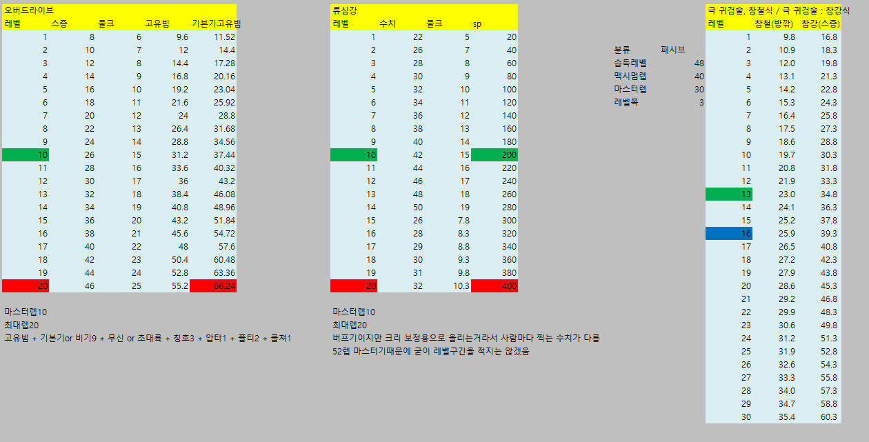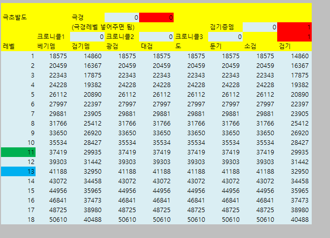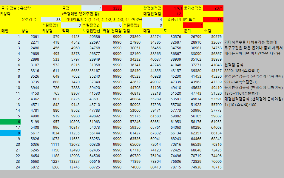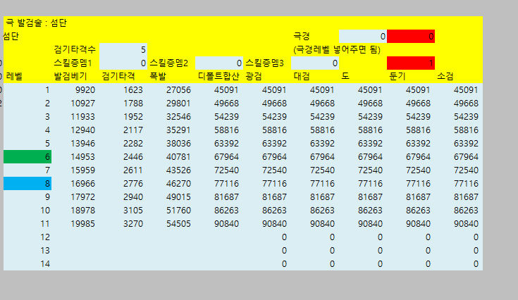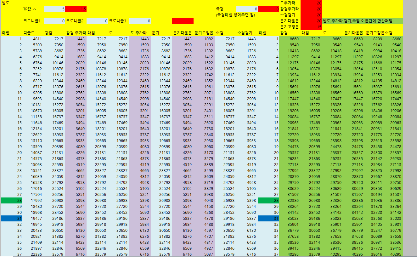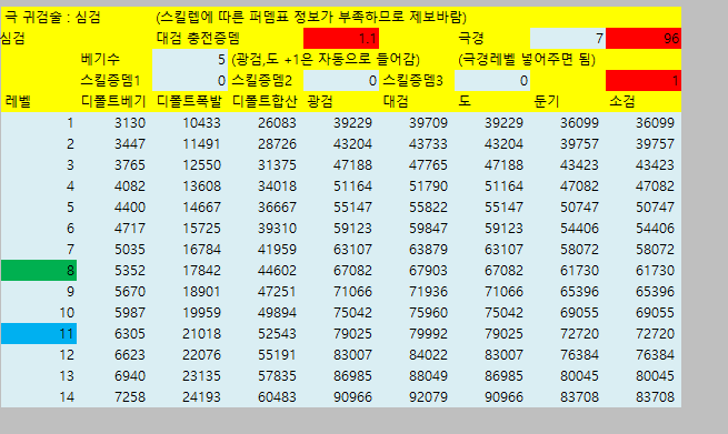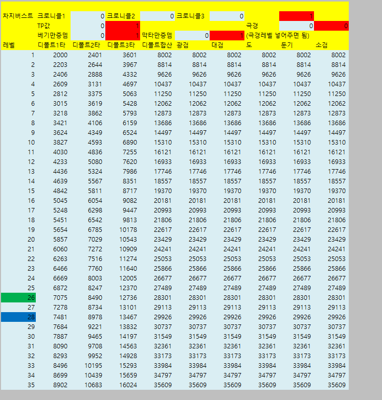 [웨펀마스터] 웨퐁 스킬표 170114거의 2년만에 갱신하는거같은데 옛날에비해 계산식이 많이 쉬워짐. 예전엔 발도 n인증뎀같은거 계산하느라 고생했는뎅 엑셀파일은 블로그에 올림 http://blog.naver.com/tr8425/220911036938" target="_blank"> http://blog.naver.com/tr8425/220911036938 거 스킬 퍼뎀 도움요청하던 아죠시 이거써 --------------------------------- 170114 18:40 수정사항 1. 오버드라이브 설명 2. 환영검무 대검 보너스 미적용 3. 폭풍식 9렙 보너스 미적용 4. 심검 보너스 미적용 5. 맹룡 소검마 적용되고있긴했는데 툴팁 따로 빼놓음 6. 자상 기대값 부분 설명 추가 |
