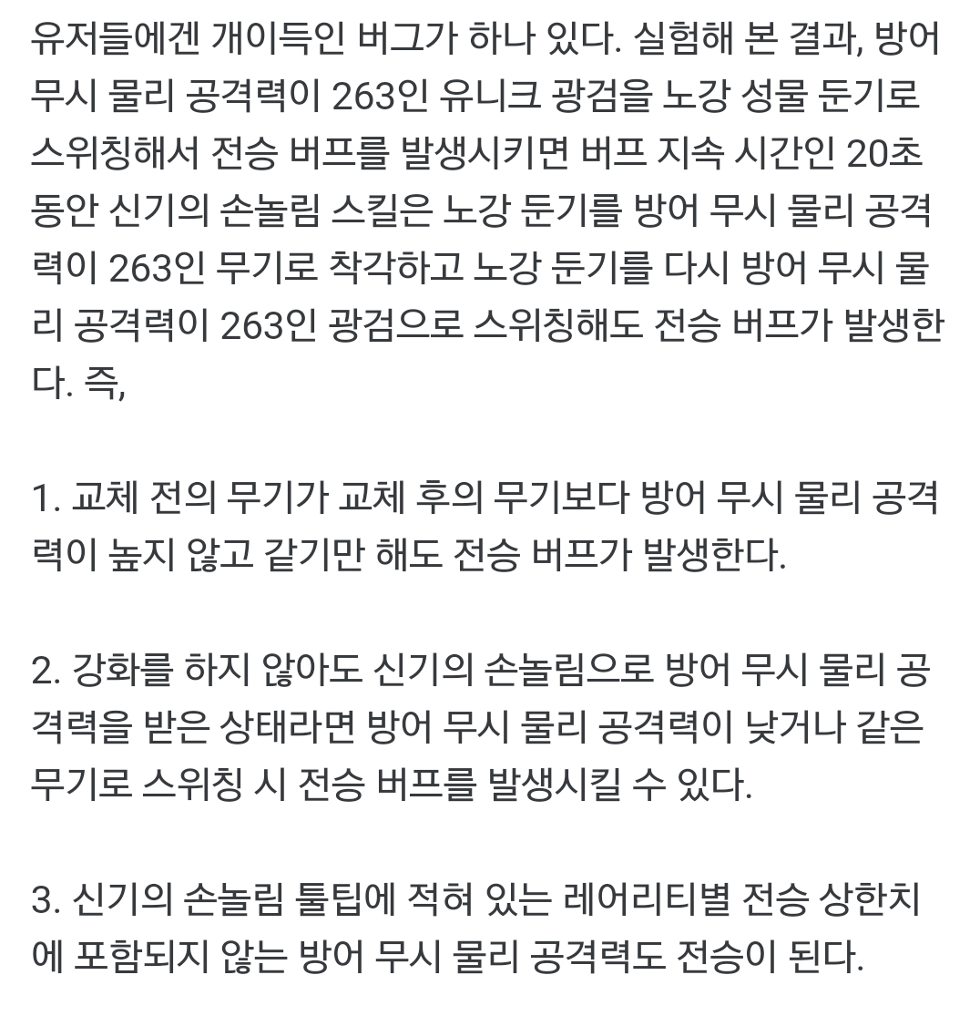 뭐 솔도로스니 아간조니 시란이니 이런 개소리는 집어치우고서라도, 어느 방향에서든 개선은 필요함. 다만 개선의 방향은 엇갈리겠지 85제 최종시절에는 무기간 호환성이나 해방이기 같은, 명확한 문제점이 존재했음. 방무전승도 사실상 일회용 옵션에 상한치마저 있고, 전승이 안되면 다른 옵션도 받지를 못하는 병신이었음이 분명함. 그런데 지금은 어떤가? 호환성이 뛰어난 90제 무기와 창성이 나왔고 올린 사진에서 처럼 버그인지 아닌지 정확하진 않으나 상기한 문제들이 사실상 전부 해결되었음에도 불구하고 여전히 사람들은 스위칭을 못마땅해 함. 아무래도 스위칭 뎀증이 단일무기 사용자들에게 스위칭을 강요하는 게 문제라고 생각하는 것 같은데(사실 이것도 스위칭 플레이라고 할 것도 아니고 그냥 일회용으로 단물 빨아먹는거지) 본인 생각에는 스위칭 컨셉의 전신인 신무교와 신기의 뎀증 옵션 잘라내고 그만큼 스킬딜에 녹여내거나 그냥 저런거 신경안써도 될만큼 딜이 존나쎄면 단일무기 쓰는 사람들 입장에서는 소리 나올 건덕지가 없음. 이쪽은 딜링적인 부분이 컨셉에 발목잡히지 않게, 라는 매우 분명한 의견을 가지고 있으니까. 지금 개편이 안되니까 얘기가 불거지는 것 뿐이라고 봄. 그게 아니라면 의견제시 부탁함. 반대로 스위칭 플레이를 하는 유저들이 정확히 원하는게 뭔지를 잘 모르겠음. 현상유지? 용이한 스위칭 플레이를 위한 개편? 일단 별로 없기도 하고 그렇게 플레이하는 사람들은 지금도 잘 플레이하고 있음. 그나마 웨게 사람들 중에는 옹호파로 레어잉여검성이 있었는데 얘도 지금 이기광검 있는데 굳이 스위칭플레이 하려나 싶음. 만약에 내가 이런 플레이를 지향한다면, 무기밸런스 이야기를 하고싶음. 스위칭플레이 하는 영상들 보면 도 같은 경우는 거의 안쓰거나 아예 안씀. 조금이나마 쓰는 사람들도 보면 그냥 광검써도 되는데 그냥 도 잡혀서 쓴거같음. 특성 비슷한 두 무기에서 하나가 속도 쿨 빠르고 딜도 비슷하거나 소폭 앞서면 뭐하러 다른걸 쓰겠어? 앞뎀의 대검, 그보단 조금 낮지만 환검 막타의 둔기, 빠른 광검, 유틸성과 검풍의 소검. 소검같은 경우에는 맹룡특화가 있긴 하지만 요즘 맹룡 잘 안쓰니 뭐 빼두고. 그럼 도는? 포지셔닝이 굉장히 애매하단 말이지. 광검이 없었다면 도가 저 포지션에 들어갔겠지만...... 단일무기로도 다도류의 하나로도 매력이 없는 도검신 하실? from Mobile