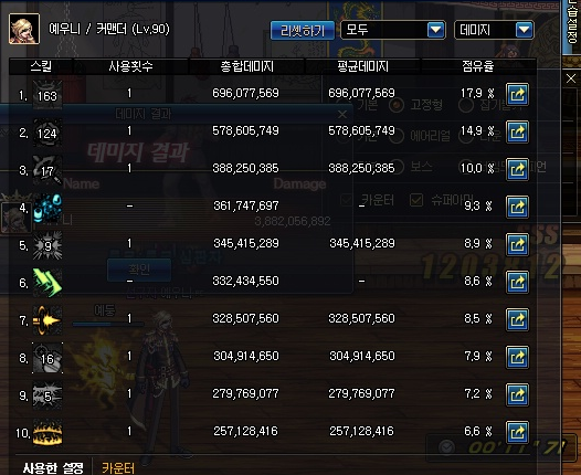 혹시 몰라서 2번 쳤는데 비슷하게 나왔어요. 패치 후 ( 1탄창 15발 -> 11발 ) 1 싸이클 (11발) : 3.5억 ㅡㅡㅡㅡㅡㅡㅡㅡㅡㅡㅡㅡㅡㅡㅡㅡㅡㅡㅡㅡㅡㅡㅡㅡㅡㅡㅡㅡㅡㅡㅡㅡㅡㅡㅡㅡㅡ <1싸이클 비교> 패치 전 : 1싸이클 15발 5.2억 패치 후 : 1싸이클 11발 3.5억 <1발당 데미지 비교> 패치전 : 1발당 데미지 5.2 / 15 = 0.347 패치후 : 1발당 데미지 3.5 / 11 = 0.318 < 1발단 하향 퍼센트 > (0.347-0.318) / 0.347 x 100 = 8.3% 결과적으로 1발당 데미지 8.3% 하향 됬습니다. ------------------------------------------------------------------ < 105렙 카운터 퍼만 딜표 > 패치전에는 10~12초 사이 나왔습니다. 패치 후에는 11~12초 정도 나옵니다. ------------------------------------------------------------------ 판단은 알아서들. |