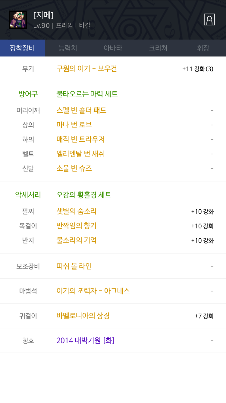 무기에 노업왕자(화속9) 황홀세트에 진:하메(화속20) 3장 법석에 노업심카(모속12) 바르고 찔러보니 일반 공대에서 받아주긴 하더라구요 조합이 프라임 게슈황홀풀염제 비탄마도 세라핌 처음부터 솔딜조합이어서 좀 당황했지만 염제님이 지강하셔서 쉽게 깨겠구나 하고 가서 토벌하고 왔습니다. 사실상 버스 받아서 깬.... 대략 98억 정도 넣긴 했는데 스패로우 쓸라치면 맨날 할배가 점프하데요 ㅂㄷㅂㄷ... 정말 딜이 딸린다는걸 너무도 실감한 하루... from Mobile
