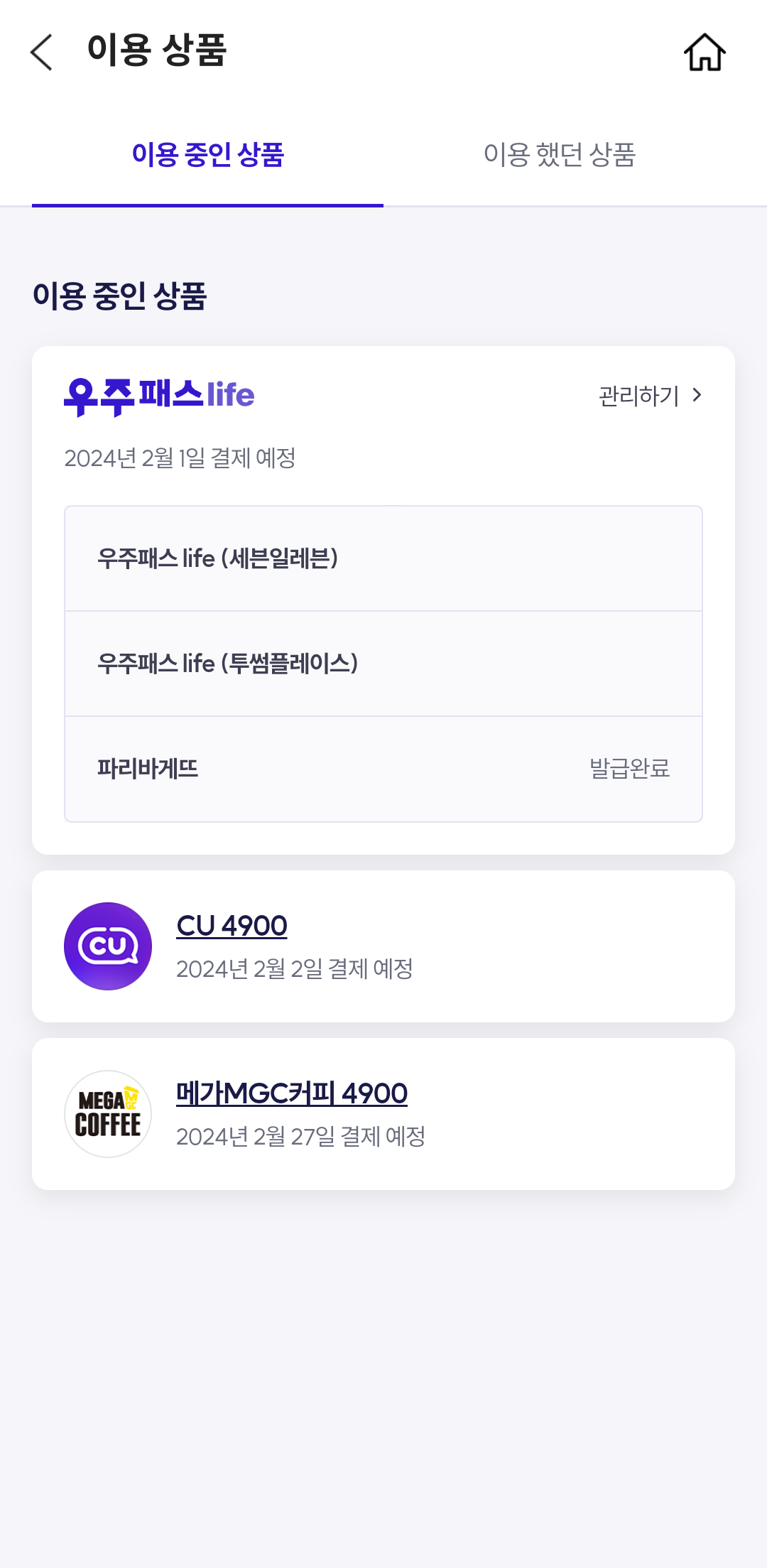 이렇게 가입을 해두면 우주패스 life 9900원 + CU 4900 990원 + 메가커피 4900 990원 해서 11880원을 결제하게 되는데