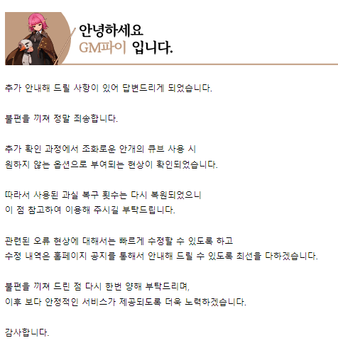 조화큐 썼을 때 오류 제보하고 복구 받았는데 과실케어 횟수 소모된다고 해서 어이없었는데 횟수 복구해줬네요?