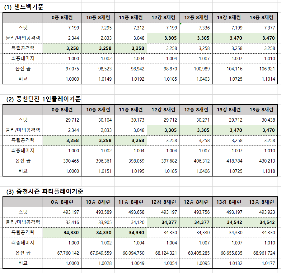 파티플레이 기준 13강 8재련 1.0132 ÷ 12증 8재련 1.0095 = 1.00366 즉 0.37% 우세하다는 뜻이니 판단해보시길